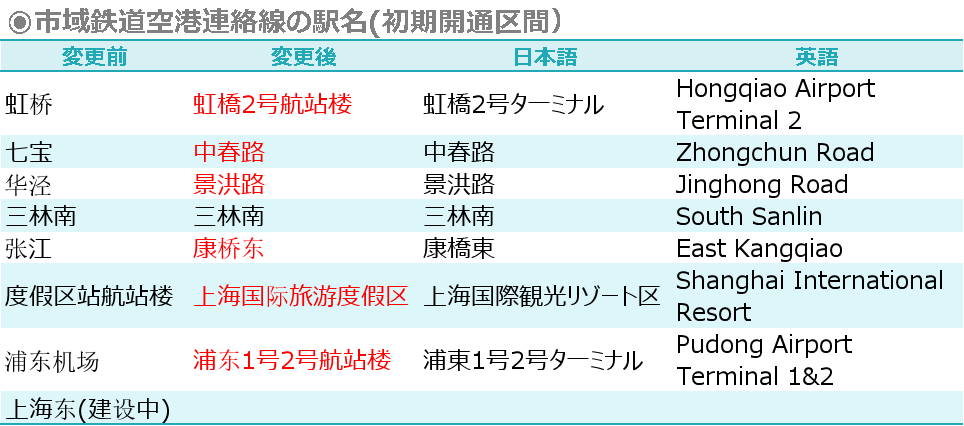 このほか、華涇駅は「景洪路駅」に、張江駅は「康橋東駅」に、度假区駅は「上海国際観光度假区駅」に、浦東国際空港駅は「浦東1号2号ターミナル駅」にそれぞれ変更される。この変更に伴い15号線、19号線(計画)の華涇西駅もそれぞれ「景洪路駅」に名称が改められる。なお、「上海国際観光度假区駅」は上海ディズニーリゾートに隣接する駅であり、空港連絡線に関する初期報道(例:南汇チャンネル2018年5月11日)では、「ディズニー駅(迪斯尼站)」の名称で報じられていた経緯がある。(編集:耕雲)